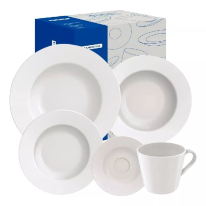 Inclui 4 pratos rasos, 4 fundos, 4 de sobremesa, 4 xícaras e 4 pires de chá.
