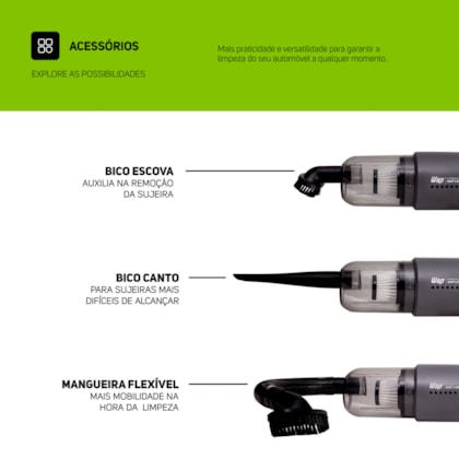 - Bico Cantos 360°: Limpa frestas de 2mm entre bancos e console