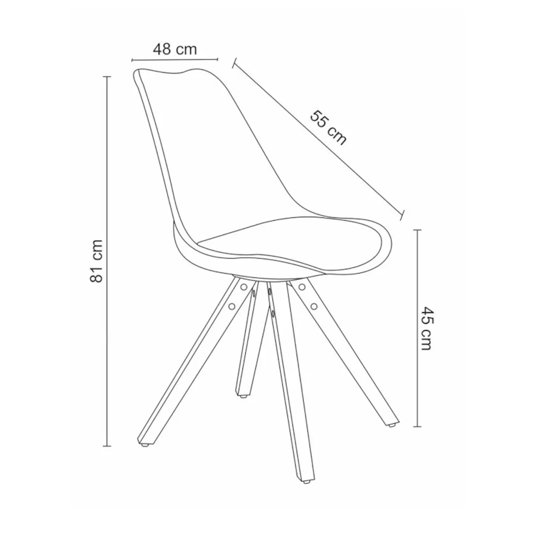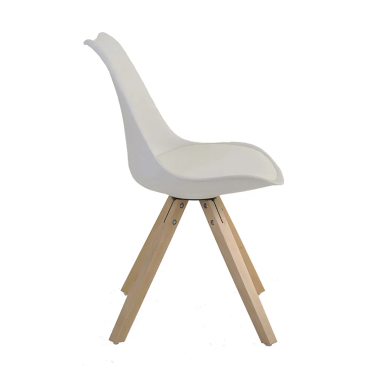 Cadeira com assento em polipropileno (PP), com encosto para as costas. Não possui braços. Possui almofada fixa no assento, revestida em poliuretano (PU), com pés de madeira em perfil quadrado.