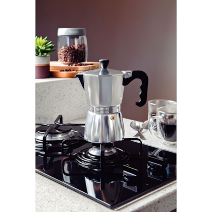 • Uso intuitivo: Água na câmara inferior, café moído no filtro, fogo médio até borbulhar.