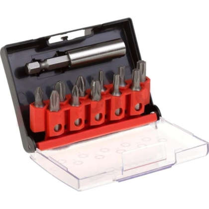 • Kit compacto 12 peças: Bits Phillips (PH1/PH2/PH3), Pozidriv (PZ1/PZ2/PZ3), Torx (T10/T15/T20/T25/T30) + porta-bit magnético.