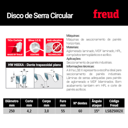 - Corte Limpo e Silencioso: Sistema anti-ruído integrado e dentes trapezoidais retos com ângulo de ataque positivo (+15°) garantem um seccionamento suave, com vibração mínima e acabamento superior, sem lascamentos.