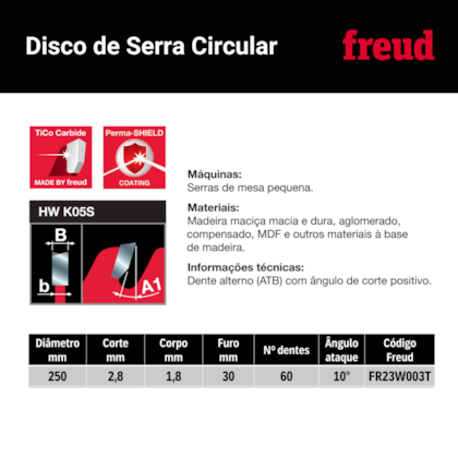Disco de Serra para Madeiras 250mm 10" FR23W003T Freud - GMAD Ecommerce