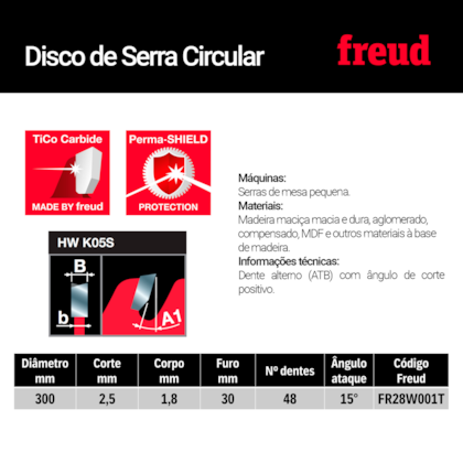 - 01 Disco de Serra para Madeiras Freud 300mm 12" (Código: F03FS09784-000)