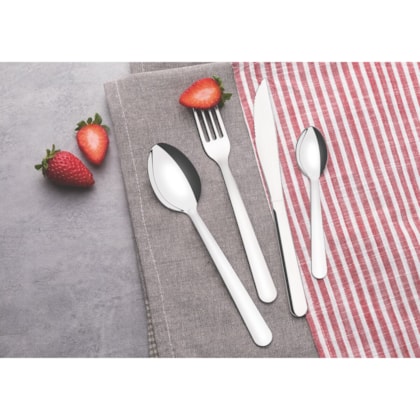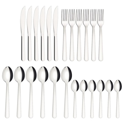 - Composição do kit 24 peças: - 6 facas - 6 garfos - 6 colheres de sopa - 6 colheres de chá