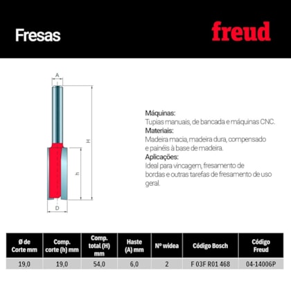 Na GMAD Ecommerce, oferecemos ferramentas de corte profissional! As fresas Freud da linha 04 são fresas retas inteiramente feitas de Carbide, evitando assim rupturas quando utilizadas corretamente, e ideais para cortes retos em madeira dura, madeira macia, MDF cru, MDF laminado, MDP cru, MDP laminado e compensado, além de acrílico para alguns modelos.
