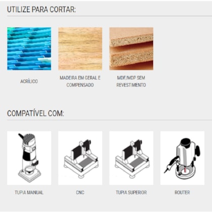 - Compatível com tupias manuais, tupias de coluna, routers e máquinas CNC