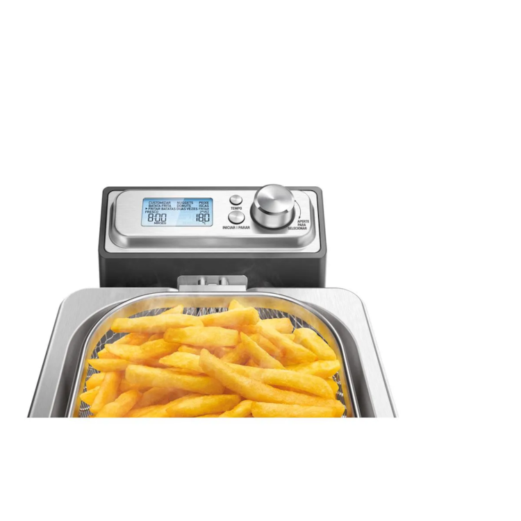 Capacidade de 4 litros com 7 pré-configurações de fritura e timer.
