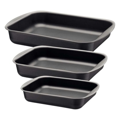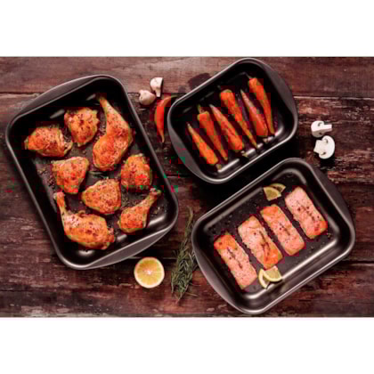 Composto por três assadeiras fundas de tamanhos variados, este jogo é ideal para preparar diversos tipos de receitas, desde bolos e tortas até carnes e assados.