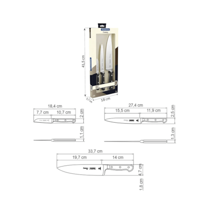 Um kit prático, compacto e perfeito para você explorar todas as possibilidades na hora de preparar bons pratos em casa. Assim é o Jogo de Facas Tramontina Century com Lâminas em Aço Inox e Cabos de Policarbonato e Fibra de Vidro 3 Peças, da linha Century. Aquelas receitas especiais, com sabor que só você consegue, ficarão ainda mais atrativas graças às peças com lâmina forjada de aço inox de altíssima qualidade que, aliada ao eficiente com tratamento térmico diferenciado, composto por têmpera, sub-zero e revenimento, além de dureza de 55 e 58 HR. Aproveite também a alta durabilidade, o equilíbrio e a segurança dos cabos de policarbonato reforçado com fibra de vidro. Não dá para perder. Sua cozinha melhor equipada e seus pratos ainda mais saborosos.