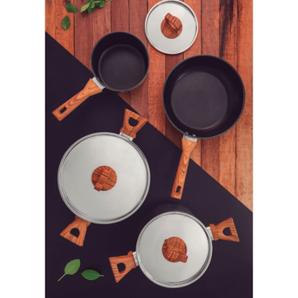 Design Moderno e Sofisticado: Os cabos e alças com acabamento efeito amadeirado acrescentam um toque de modernidade e sofisticação, complementando a beleza e o requinte das peças. E, com protetor de chamas, evitam que aqueçam ou queimem quando a chama não estiver centralizada no fundo da panela.