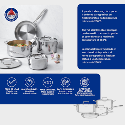 • Corpo triplo: Aço inox + alumínio + aço inox para distribuição uniforme de calor e economia de 30% em energia.