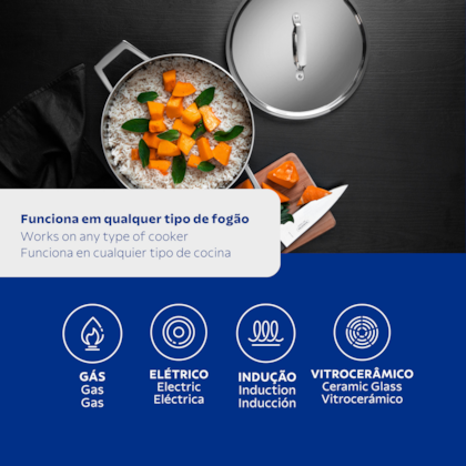 • Multicompatibilidade: Fogões a gás, elétrico, indução e vitrocerâmico.