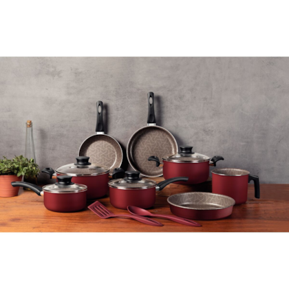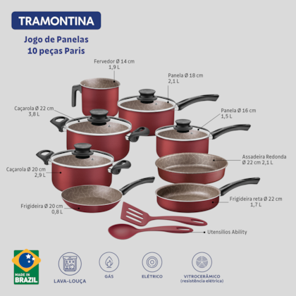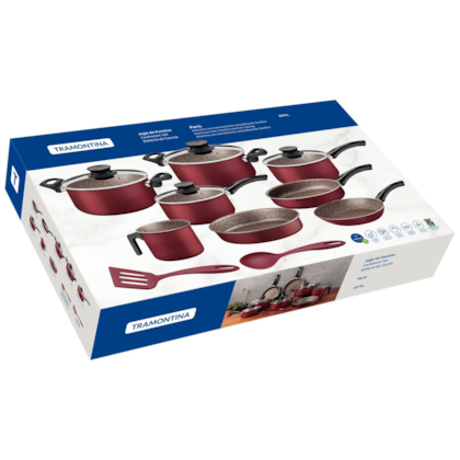Sabe aquele item essencial para uma cozinha funcional e cheia de estilo? Com certeza, é o jogo de panelas Tramontina Paris em alumínio com revestimento interno e externo em antiaderente Starflon Max vermelho 10 peças. Adequado para uso diário, ele tem peças desenvolvidas em alumínio com revestimento em Starflon Max, características que juntas, cozinham os alimentos de maneira rápida e uniforme, sem grudar na superfície. Suas panelas e caçarolas vem com tampas de vidro temperado, com saída de vapor e bordas de aço inox e todas as peças de fogão tem cabos, alças ou pegadores em materiais antitérmicos, que não aquecem e oferecem maior segurança durante o manuseio. Além de todos esses atributos, o jogo pode ser levado à máquina de lavar louças e acompanha dois utensílios de nylon que suportam temperaturas até 180 °C e são ideais para utilização em superfícies antiaderentes!