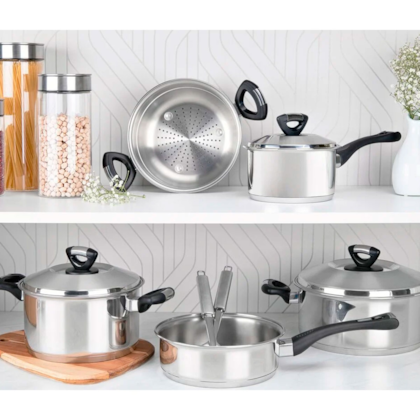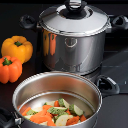 Aço inox 18/10 com fundo triplo: cozimento uniforme, mais rápido e eficiente, sem deformar e com maior preservação dos sabores.