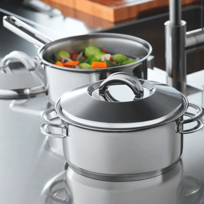 Tampas de Inox: As tampas de inox com saída de vapor e encaixe perfeito permitem que você acompanhe o cozimento sem precisar levantá-las, mantendo o calor e os aromas dentro da panela.
