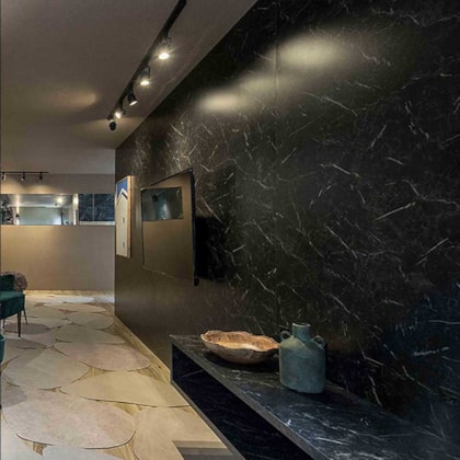 Para projetos que pedem o protagonismo das pedras, a Berneck apresenta o padrão Marquina. De muita personalidade, seu desenho reproduz o mármore negro e garante muita sofisticação para móveis e interiores. A presença das pedras na decoração reforça ainda uma tendência de combinar materiais e texturas no mobiliário – principalmente mármore e madeira. O painel Marquina é uma ótima indicação para aplicação no mobiliário, incluindo frentes de armários, fundo de estantes, tampos de bancadas e mesas de canto e centro. Também pode ser aplicado em grandes superfícies – dada a beleza do seu desenho.