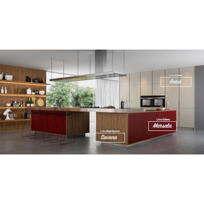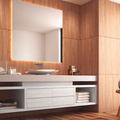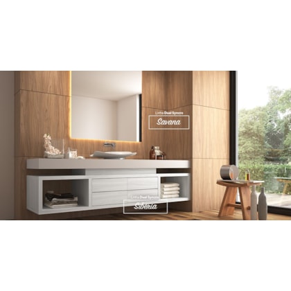 MDF de tonalidade clara, fria, com leves nuances de cinza que dão efeito discreto e trazem a dose ideal de personalidade ao ambiente.