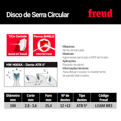 - Carbide TiCo de Alta Durabilidade: Dentes fabricados com pastilhas de metal duro de micro grão com titânio e cobalto, garantindo cortes extremamente precisos e uma vida útil prolongada, mesmo em uso intensivo.