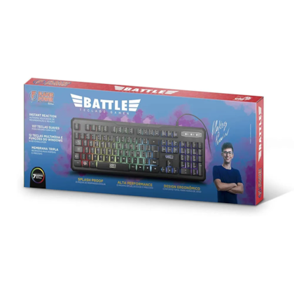 O Teclado Gamer Battle foi desenvolvido com tecnologia de membrana tripla para respostas mais rápidas e precisas. Iluminação backlight 7 cores com 8 efeitos customizáveis. Total de 107 teclas. 12 teclas de atalho multimídia e funções do Windows. Curso de acionamento das teclas de 0,9mm. Curso total das teclas de 3.5 ± 0.3 mm. Durabilidade das teclas de 20 milhões de toques. Conexão USB 2.0. Cabo com 1,35m.