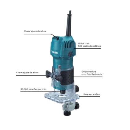 Tupia Makita 3709 com Base Articulada, 530W, 127V, pinça 6mm para cortes precisos.