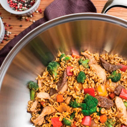Inovador Fundo Triplo: O fundo triplo desta wok, composto por camadas de aço inox, alumínio e aço inox novamente, garante uma distribuição uniforme de calor, resultando em um cozimento rápido e econômico, além de manter os alimentos aquecidos por mais tempo.